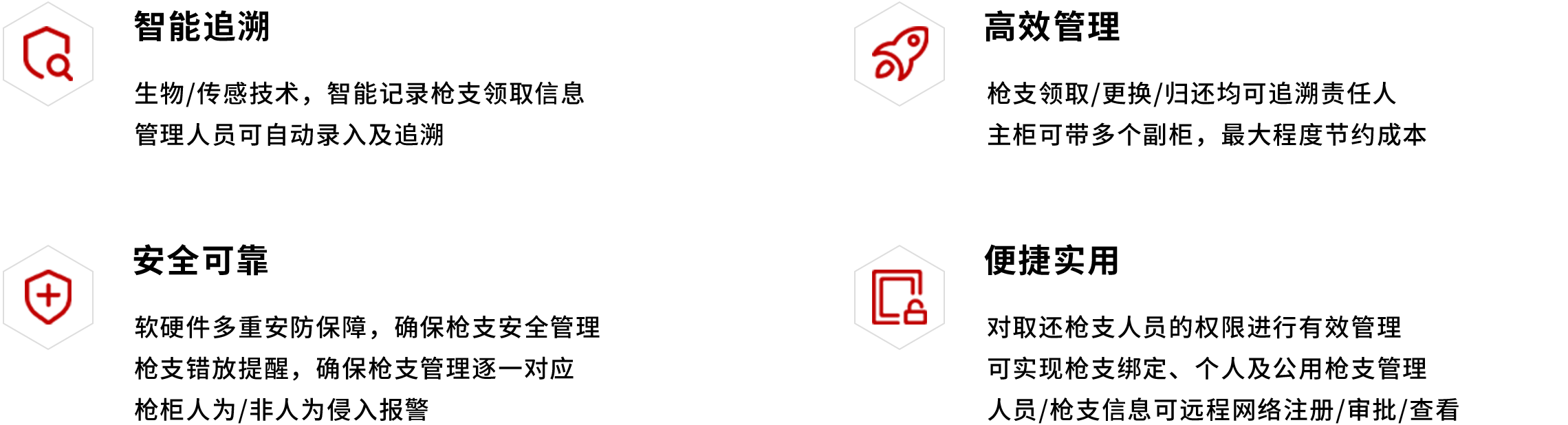 智慧槍彈室管控一體化解決方案是一套針對用槍管理工作特點,由智能槍彈柜及智能槍彈安防管控系統(tǒng)組成,集指紋信息采集功能、槍支入柜、槍支出柜、槍支領(lǐng)用、歸還槍支、狀態(tài)查詢、緊急用槍、系統(tǒng)維護、槍支維護、用槍超時報警、視頻監(jiān)控等多種功能于一體,綜合運用嵌入式、自動控制、智能識別、安防監(jiān)控、移動短信等多種先進技術(shù)的槍支、彈藥管理的解決方案。